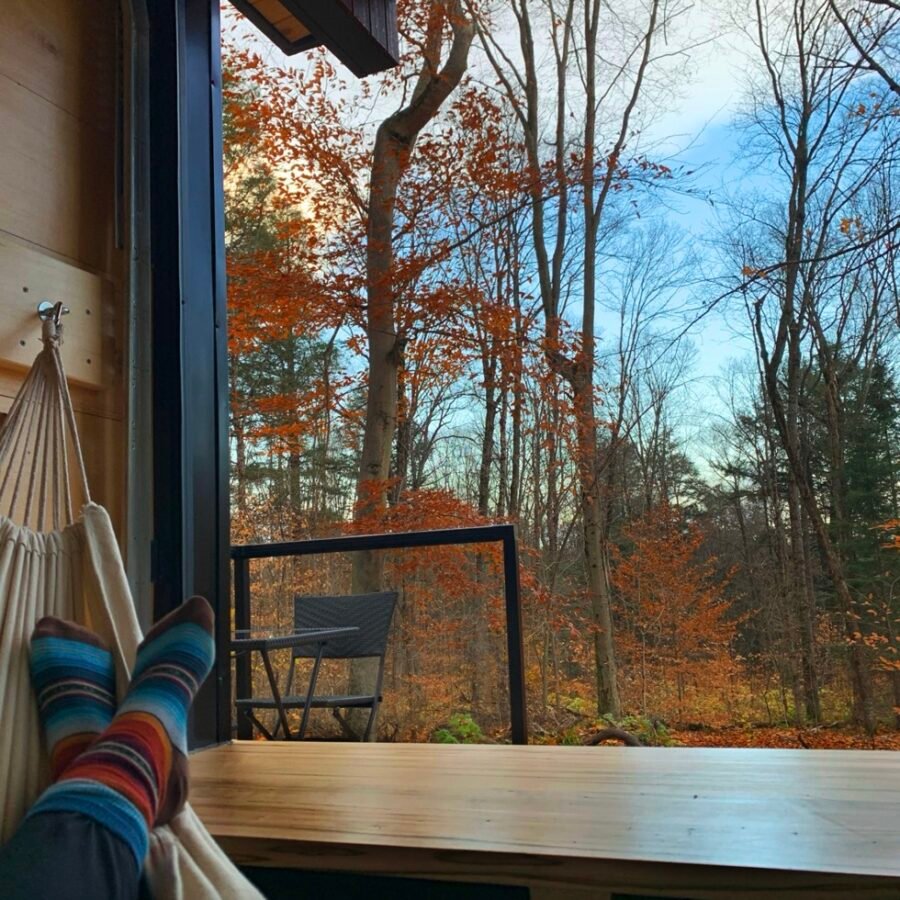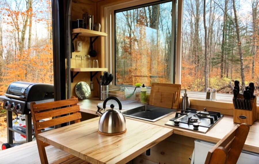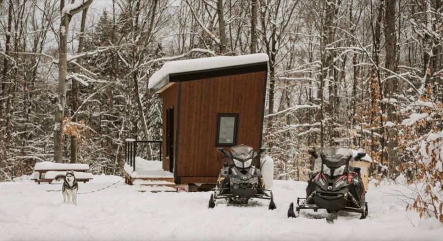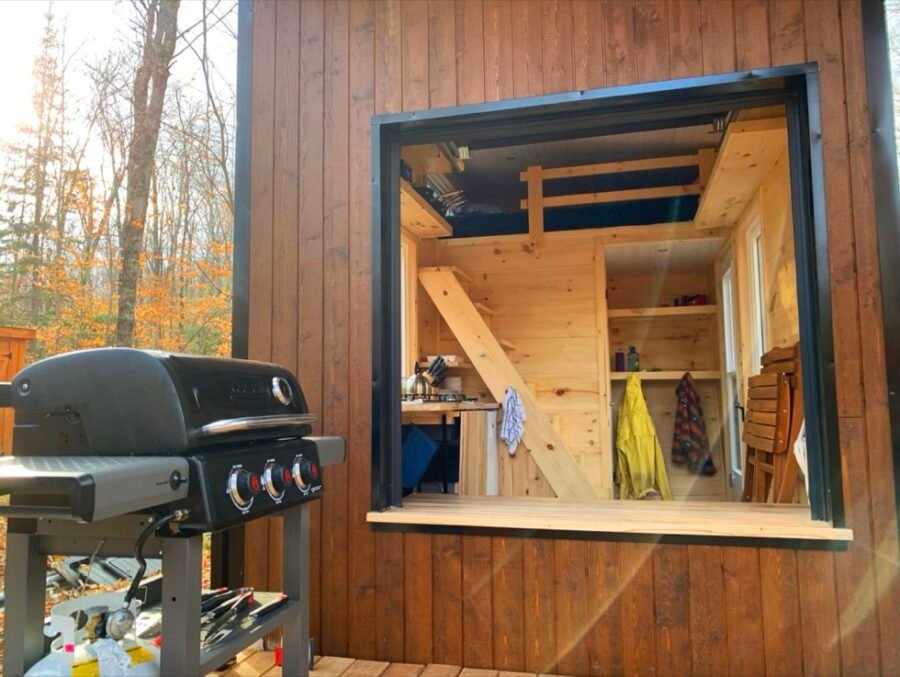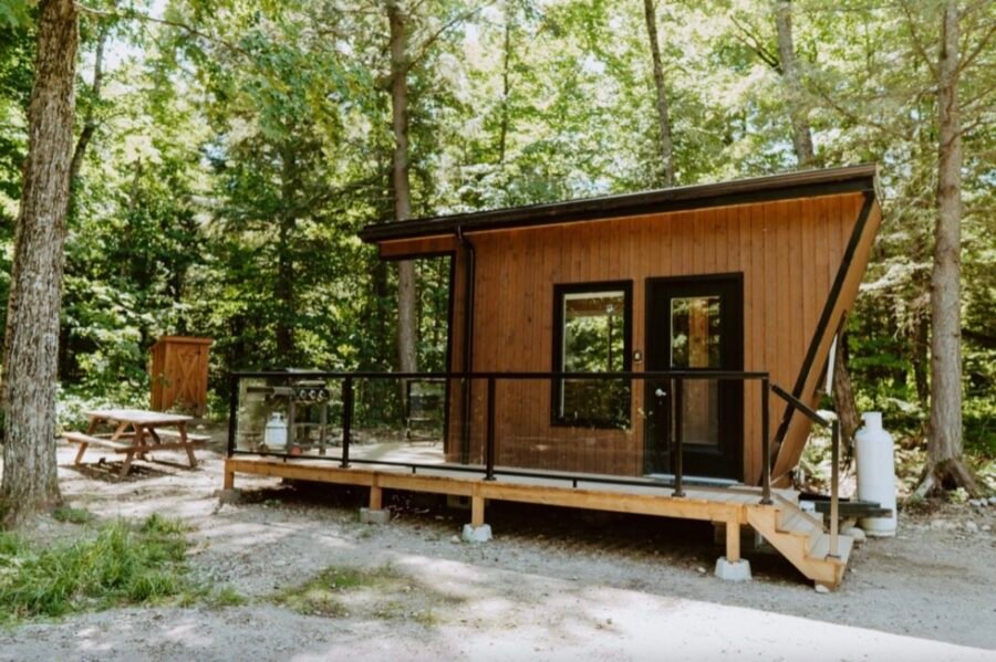 The tiny home is on a cleared campsite in the Haliburton Forest & Wild Life Reserve.